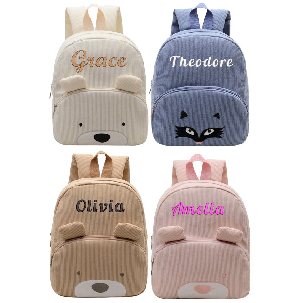 Get the Cute Corduroy Cartoon Bear Small Backpack! Personalize it with a name embroidery in white thread. This lightweight, comfortable, Kawaii bag (30x25x11cm) is perfect for travel, preschool, or casual use.