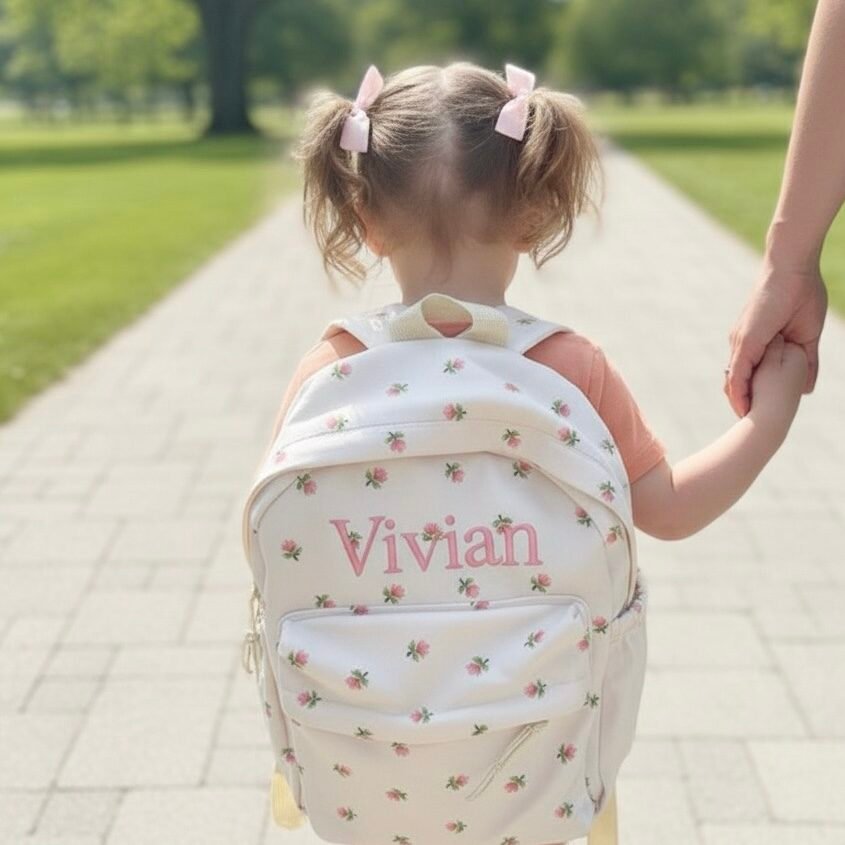 Featuring a sweet floral print and durable construction, this bag is perfectly sized for toddlers and preschoolers. The child’s name is beautifully embroidered in pink satin thread right on the front, ensuring their bag is always easy to spot—no more mix-ups!